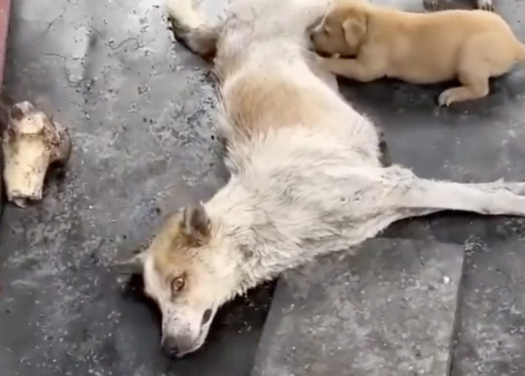 Struggle to breastfeed her cubs, The disabled mama dog weakly begged to save her 7 puppies in vain