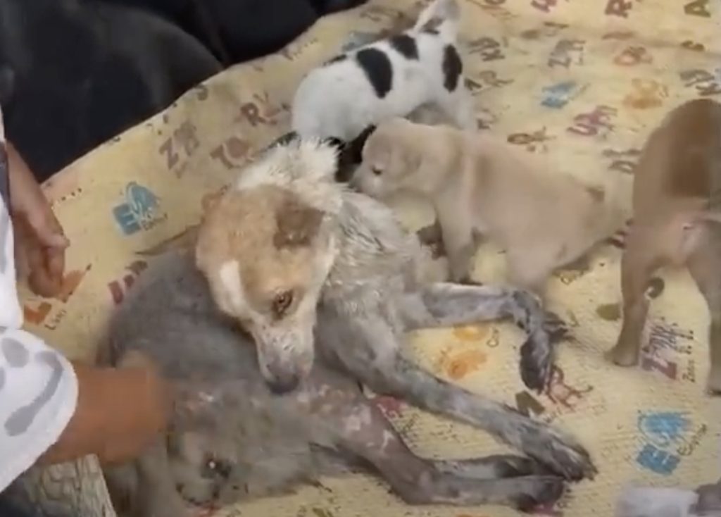 When a kind passerby noticed her condition, they immediately reached out to a local rescue group. Within hours, a compassionate rescuer arrived and carefully lifted Saria and her pups into safety. The journey to the veterinary clinic was silent except for the soft whimpers of the puppies. The rescuer gently stroked Saria’s head, whispering, “Hold on, Mama, help is here.” It was as if Saria understood—her eyes, weary but trusting, closed slowly as she drifted into the safety of human hands.