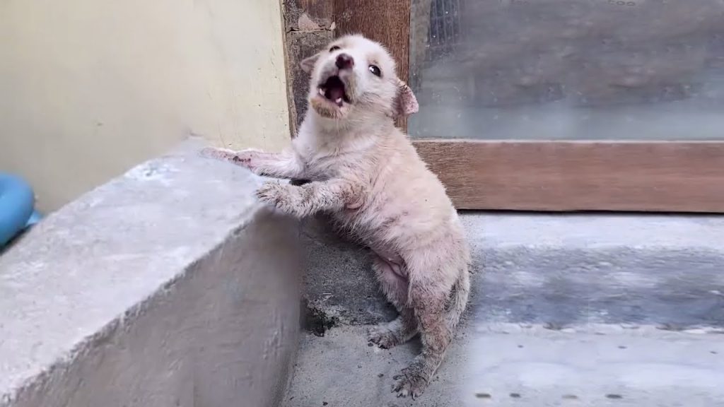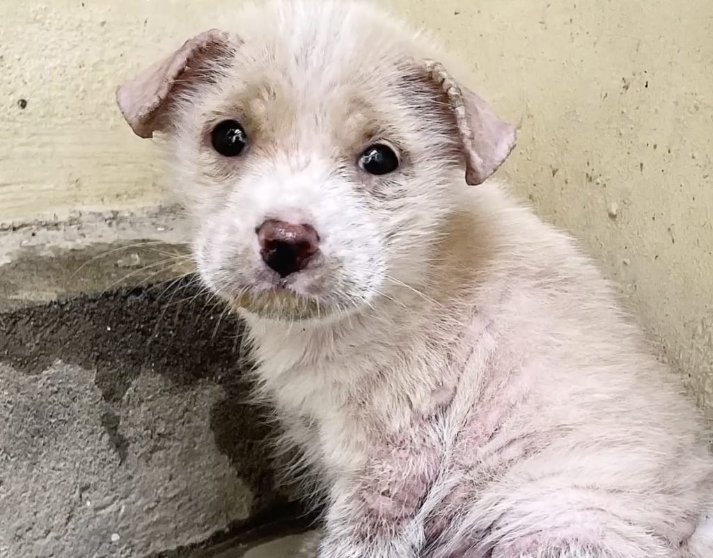 Willow’s story begins on an ordinary day in a small marketplace — a place usually filled with the chatter of vendors and the aroma of food stalls. Yet hidden among the noise and movement was a sight that would quietly break anyone’s heart: a tiny puppy, shivering and alone, pressed against a wall for warmth. Her cries were faint, weak from exhaustion and hunger. Her skin was inflamed and raw, her fur missing in patches, and her body told the story of a creature who had suffered far more than any little soul ever should.