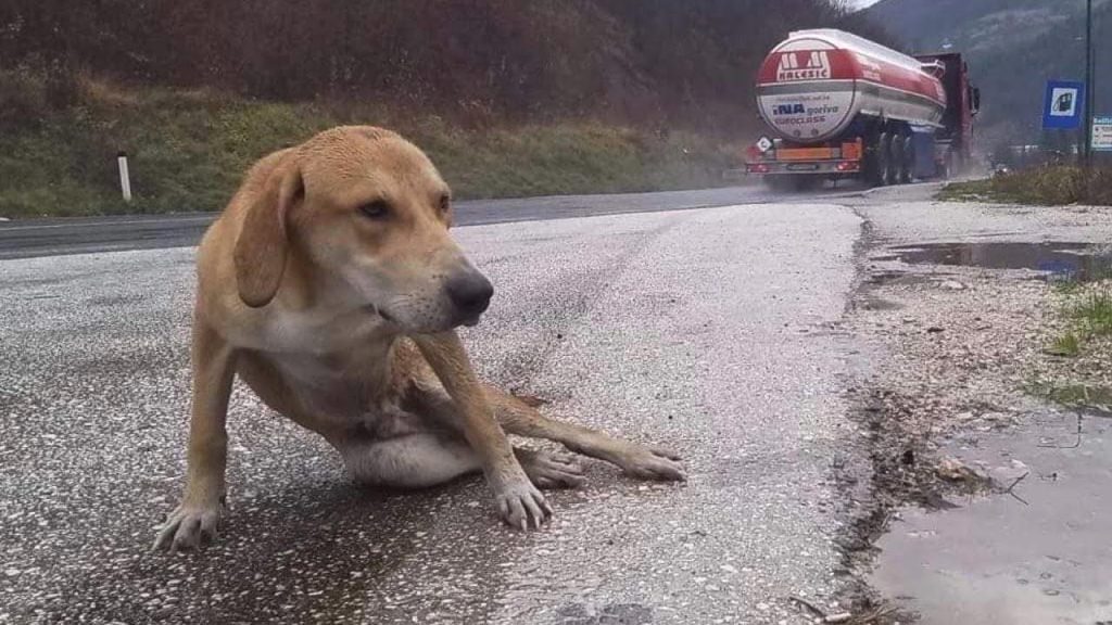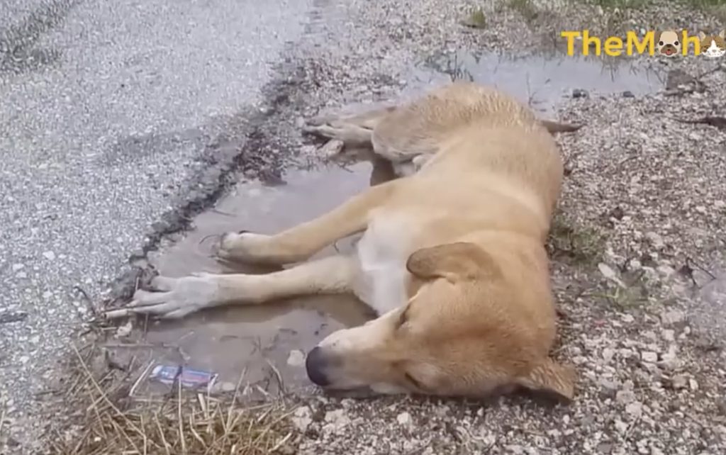 It begins with a haunting image that grips the heart. On the side of a busy highway, in a shallow puddle of muddy water, lies a motionless dog. Cars race past without slowing down, their tires splashing through the rain-soaked road as life rushes on. Yet in that forgotten corner, a fragile life is slipping away. The dog doesn’t move. His fur is matted with dirt, his eyes dull and distant, as though he has already surrendered to pain and despair. It feels as if he has accepted his fate—cold, wet, and utterly alone.