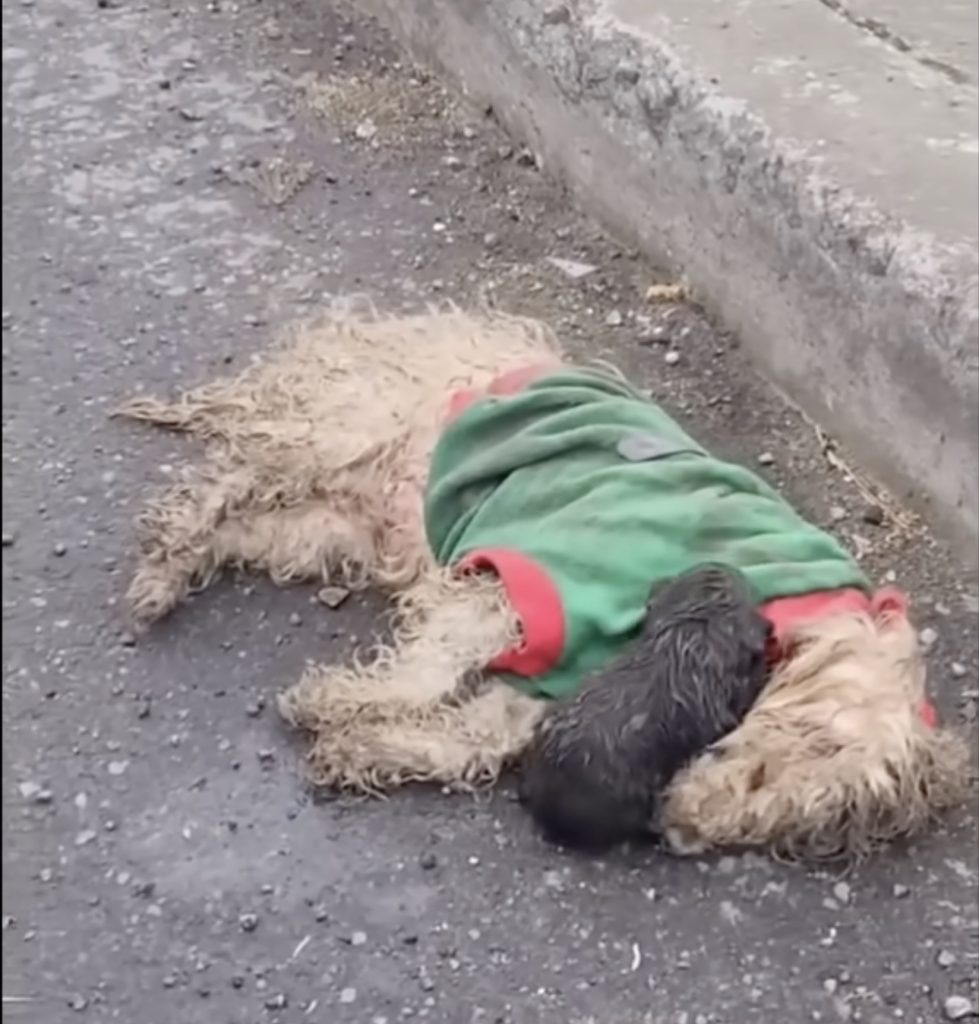 On the edge of a crowded highway, where the noise of engines drowns out almost everything, a heartbreaking sight quietly unfolds. A frail, dirt-covered dog lies motionless by the roadside, her tangled fur caked with mud and dust. Her body looks lifeless, still and defeated, as if the weight of suffering has finally silenced her. Next to her, pressed close for warmth and comfort, a single newborn puppy refuses to leave her side. Tiny and trembling, the little one seems unaware of danger—his only instinct is to stay near the mother who once kept him safe. It is a scene that captures both despair and devotion in their purest form.