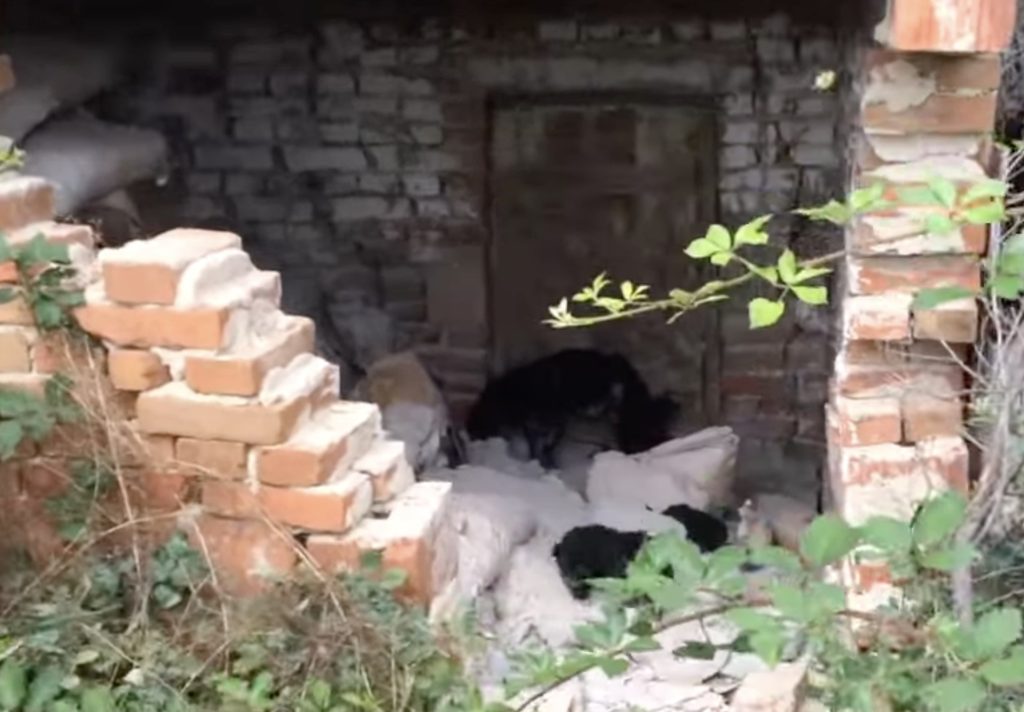 A rescuer set out immediately, following the directions given to him. The road to the site was rough and overgrown, the kind of place where nature had taken back what people once left behind. When he finally reached the crumbling structure, the scene before him was heartbreaking. Inside a small, dark room with broken walls and dust thick in the air, he found a mother dog curled protectively around her five newborn puppies. They were surrounded by nothing but piles of torn, old sandbags and chunks of cement. There was no food, no water, and barely any shelter from the cold wind that crept through the cracks.