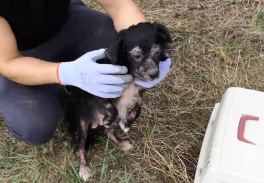 The mother looked up when she saw him. Her body trembled slightly, not out of fear, but exhaustion and illness. Her skin was raw and red from a severe case of mange — a painful condition that had caused most of her fur to fall out. Open sores dotted her thin frame, and she looked so weak that it seemed a miracle she had managed to care for her puppies at all. Yet, in her eyes, there was still a quiet spark — a flicker of hope. When she realized that someone had come to help, her tail gave the faintest wag, as if she finally knew that the long, lonely struggle was about to end.