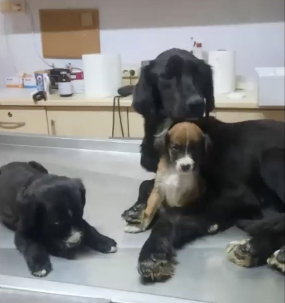 A kind passerby spotted them—this fragile family alone in the rain—and immediately contacted a local rescue group. The team arrived without hesitation. What they saw was devastating. The mother dog, a black Labrador mix, had a deep, bleeding wound on her leg, likely left untreated for days. Her ribs were visible, her eyes dull yet still full of silent pleading. But even in her pain, she pressed herself closer to her pups, as if to shield them from the world that had failed them.