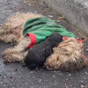On the edge of a crowded highway, where the noise of engines drowns out almost everything, a heartbreaking sight quietly unfolds. A frail, dirt-covered dog lies motionless by the roadside, her tangled fur…